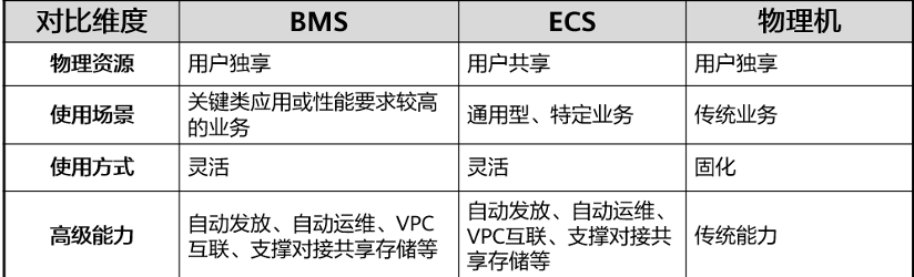 一台 BMS 完全独占物理硬件,不存在与其他用户共享资源的情况,数据隔离性远超虚拟化的 ECS,满足金融、政务等行业的合规要求