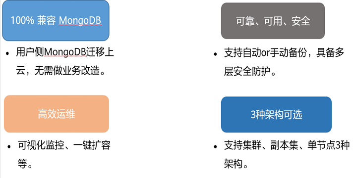 完全兼容MongoDB协议,提供安全、高可用、高可靠、弹性伸缩和易用的数据库服务,同时提供一键部署、弹性扩容、容灾、备份、恢复、监控和告警等功能。DDS的基本管理单元是实例,与关系型数据库不同,DDS实例由数据库、集合、文档三部分组成。