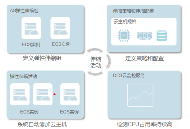 监控数据,随着应用运行状态,动态增加或减少弹性云服务器实例;用户可根据业务预期及运